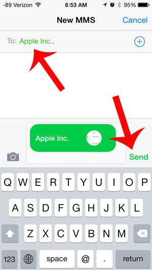 步骤 6:将您想要与其共享联系人的人员的电话号码或姓名输入到到屏幕顶部的字段,然后触摸发送按钮。