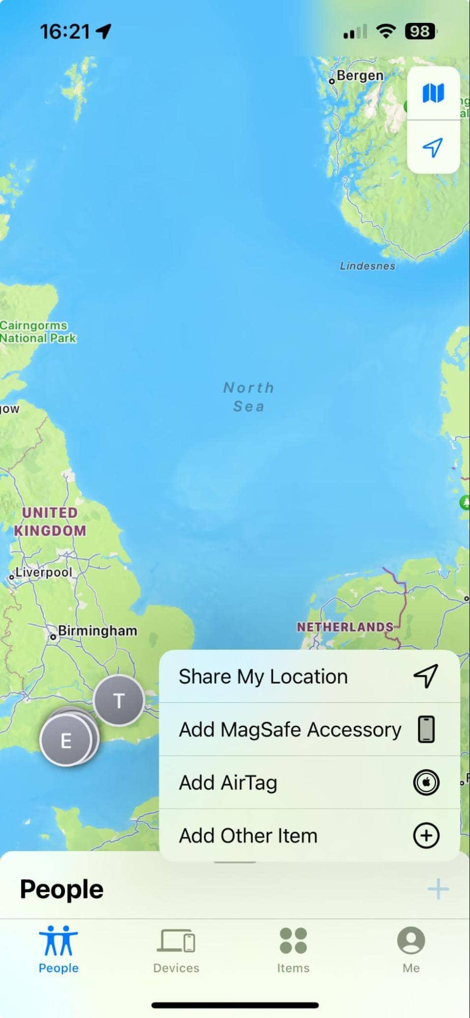您无需使用“家人共享”即可使用“查找我的”应用程序;您可以通过点击 + 按钮并与您的联系人永久或暂时共享您的位置来邀请非家庭成员直接进入应用程序。