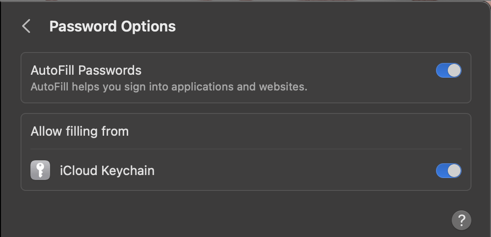 下一个,在“密码”下,单击“密码选项”。确保自动填写密码已打开并且允许填充来自和设置验证码两者同时使用iCloud 密码和钥匙串。