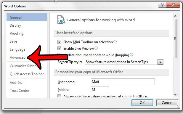 第 4 步:单击先进的左侧的选项卡单词选项窗户。