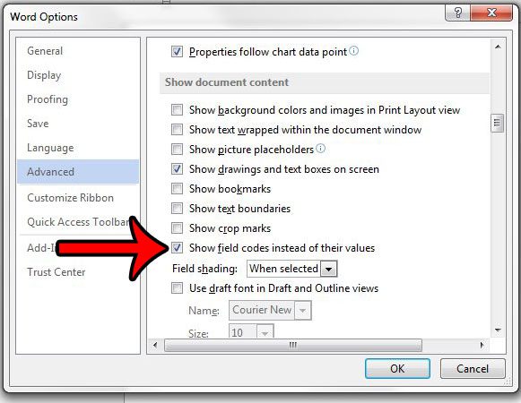 第 5 步:向下滚动到文件内容菜单部分,然后选中左侧的框显示字段代码而不是其值。然后您可以单击好的按钮位于窗口底部以保存更改。