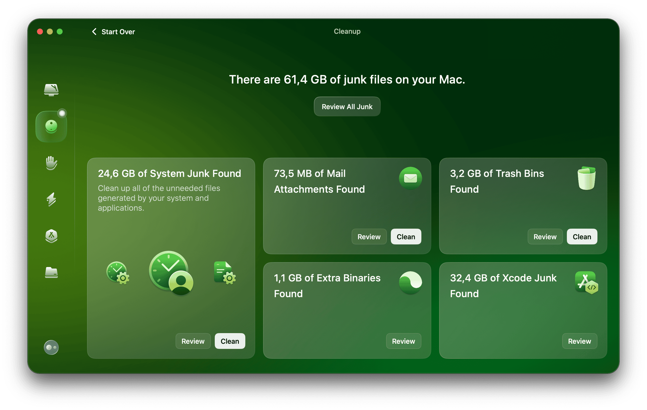 CleanMyMac 的系统垃圾模块旨在帮助用户定位和删除大量堆积的数字杂物,例如临时和损坏的文件、缓存和系统日志。帮助节省存储空间提高性能。以下是如何使用这个方便的工具: