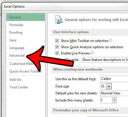 - 点击先进的在Excel 选项窗户。