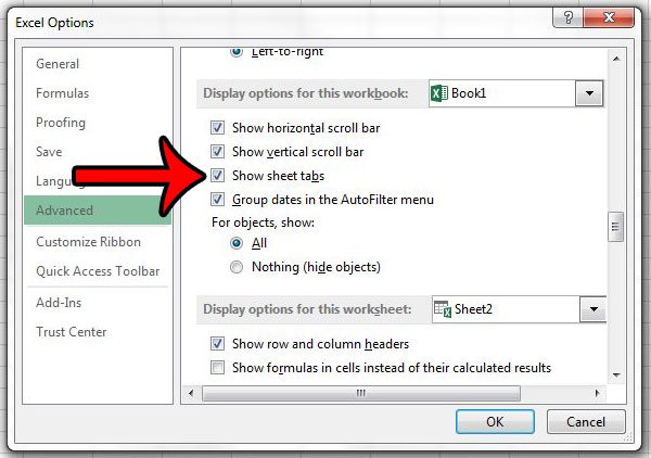 第 5 步:向下滚动到显示此工作簿的选项部分,然后选中左侧的框显示工作表选项卡。