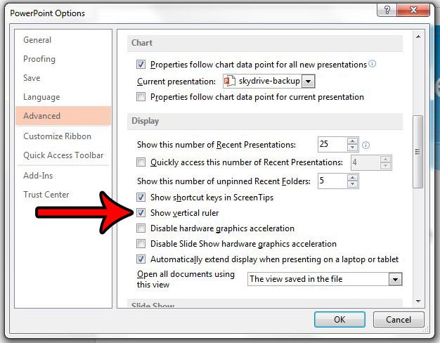 第 5 步:向下滚动到展示部分,然后选中显示垂直标尺左侧的框。单击好的按钮位于窗口底部。