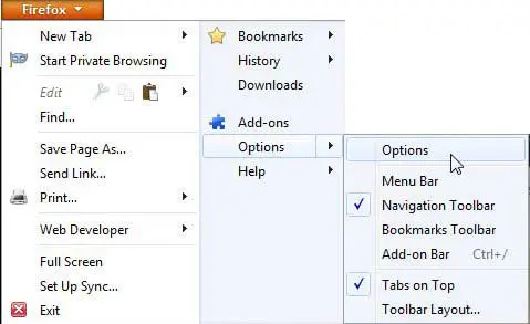 第 2 步:单击火狐浏览器窗口左上角的选项卡,单击选项,然后单击选项再次。