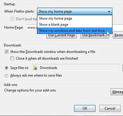 但 Firefox 还提供另一种选择,您可以选择让它打开上次关闭浏览器时打开的窗口和选项卡。