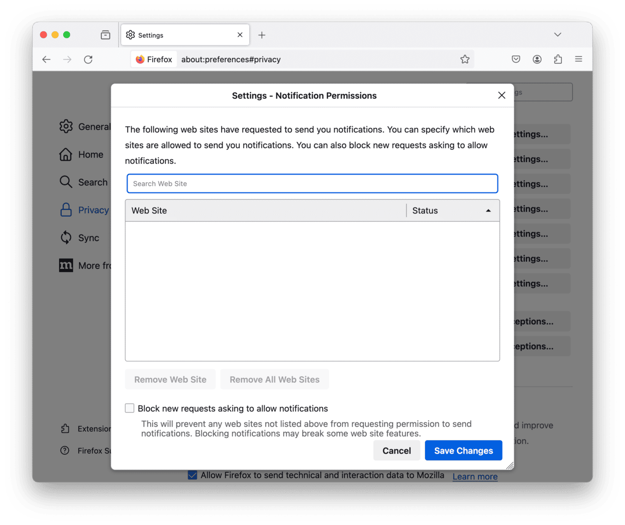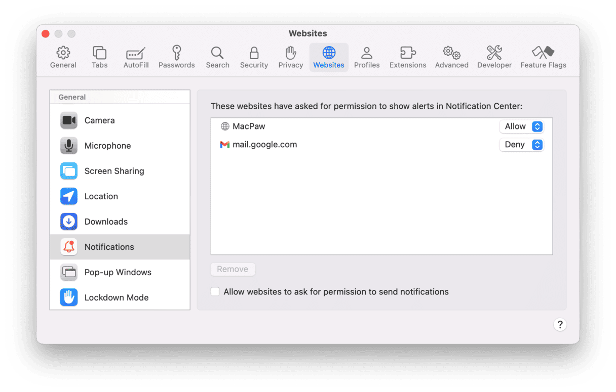 - 取消选择窗口底部的框。 “允许网站请求许可发送推送通知。”