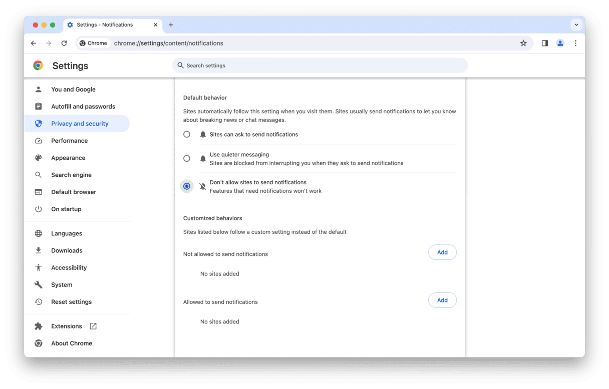 Chrome 允许您关闭特定于站点的通知以及一般警报。让我们从基本的通知开始