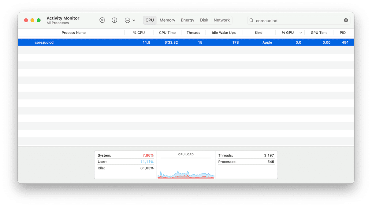 转到“应用程序”>“实用程序”并打开“活动监视器”。单击“CPU”选项卡。您应该会看到按所使用的 CPU 周期百分比排序的进程列表。如果 coreaudiod 的 CPU 使用率较高,您会在列表顶部或附近看到它。
