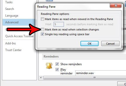 第6步:点击左侧的方框选择更改时将项目标记为已读删除复选标记。然后您可以单击好的在这个窗口和展望选项窗口来应用并保存这些更改。