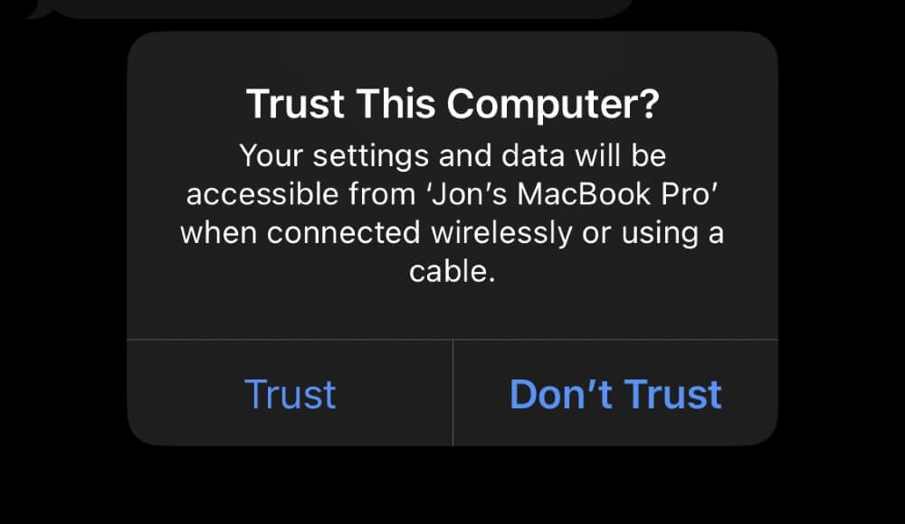 如果将 iPhone 插入 Mac 时出现以下提示,您可能需要在 iPhone 上点击“信任”。