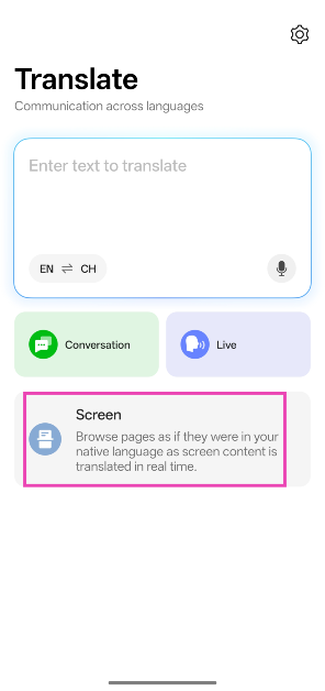 启动翻译应用程序,选择“屏幕”,然后设置源语言和目标语言。点击“全屏”即可转换屏幕上的语言。