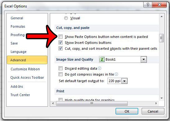 第 5 步:向下滚动到剪切、复制和粘贴菜单部分,单击左侧的框粘贴时显示粘贴选项按钮删除复选标记,然后单击好的窗口底部的按钮来应用您的更改。