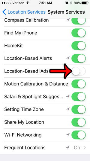 第五步:点击右侧的按钮基于位置的 iAd将其关闭。当按钮周围没有绿色阴影时,该设置被关闭。下图中基于位置的 iAd 已关闭。