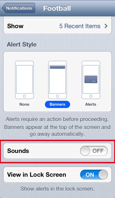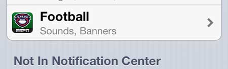 第 3 步:向下滚动到足球选项。请注意下图中选择的选项,因为该选项适用于新应用程序。标记为 ESPN FFL 的是旧应用程序,调整其中的设置不会禁用新应用程序上的声音。