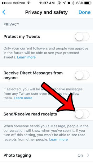 第6步:点击右侧的按钮发送/接收已读回执将其关闭。当按钮周围没有绿色阴影时,该设置被禁用。如下图所示,它已关闭。然后您可以点击完毕屏幕右上角的按钮可保存更改并退出菜单。