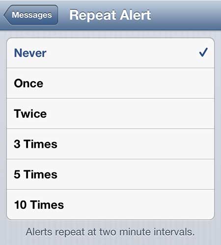 默认情况下,您的 iPhone 5 会在您收到新消息时通知您,然后两分钟后,它会再次通知您。