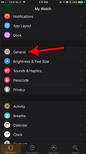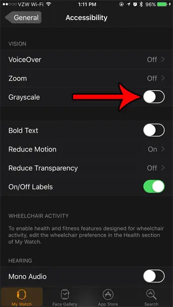 幸运的是,您的手表进入黑白模式很可能是由于设备灰度设置的更改引起的,而不是表示存在问题。我们下面的教程将向您展示在 iPhone 上的 Watch 应用程序中如何找到该设置,以便您可以将其关闭并恢复您习惯的原始明亮色彩显示。