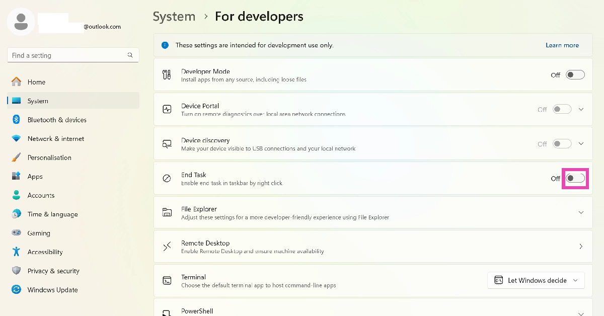 前往设置>系统>开发者专用并打开“结束任务”的切换开关。右键单击应用程序的图标并选择“结束任务”。
