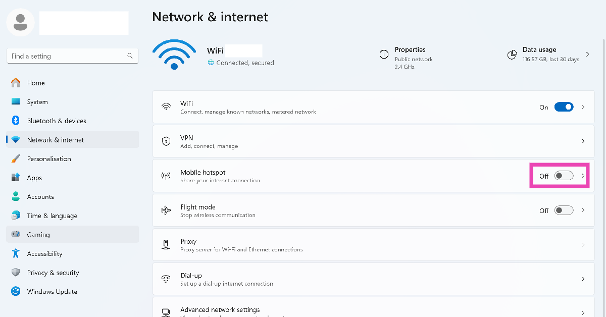 前往设置>网络和互联网,然后打开“移动热点”旁边的切换开关。