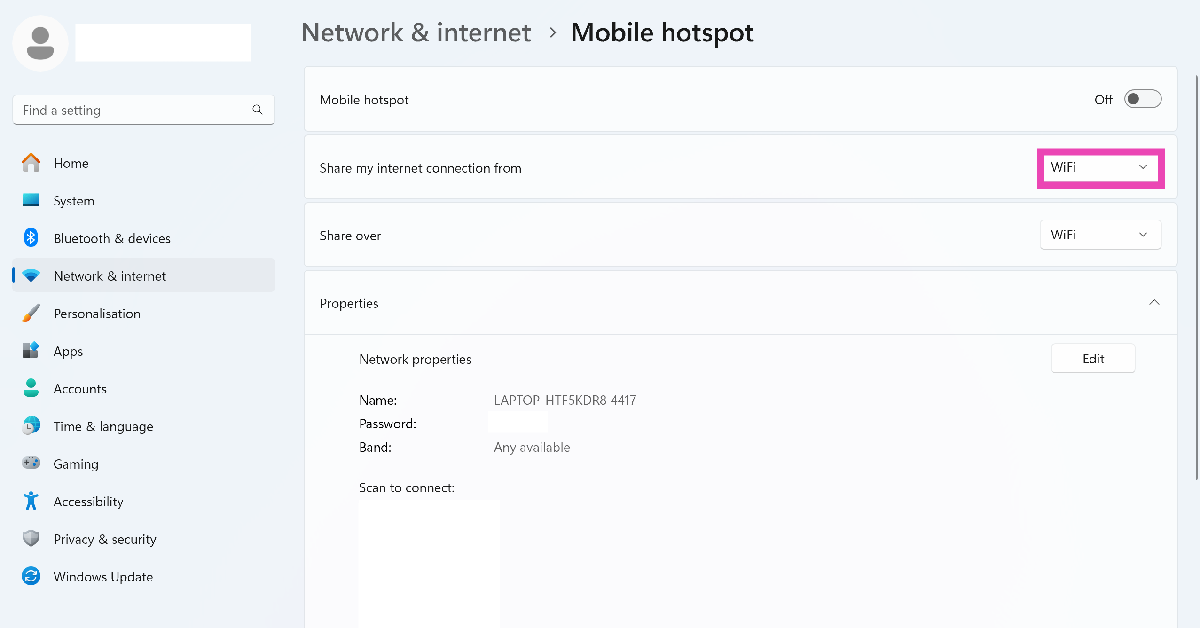 第5步:您可以通过扫描以下二维码将任何设备连接到 Windows 11 PC 的移动热点:特性部分。或者,您可以手动选择设备上的热点网络并输入密码。
