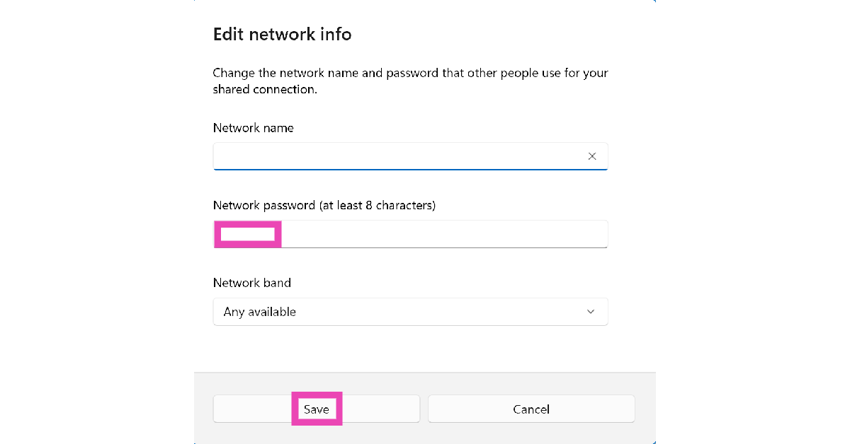 前往设置>网络和互联网>移动热点,然后点击“网络属性”旁边的编辑按钮。输入新密码并点击“保存”。