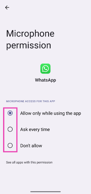 您的 Android 智能手机为设备上安装的应用程序提供不同的麦克风访问级别。当您第一次启动应用程序时,系统会询问您是否要授予其对麦克风的访问权限或拒绝它。您可以允许应用程序在前台运行时使用麦克风。一旦手机的麦克风处于活动状态,您就会注意到屏幕左上角有一个绿色的麦克风图标。