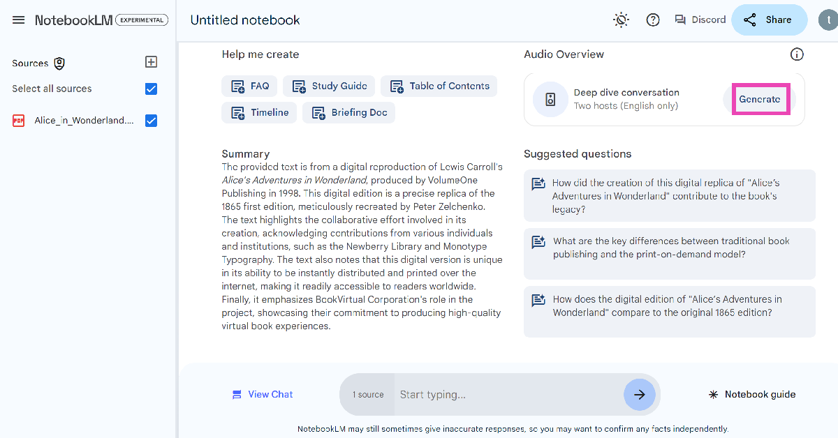 来源上传后,您可以向研究助理询问与文本相关的任何问题。音频概述功能获取文本并将其转换为两个主持人之间的交互式对话。您可以使用此功能将任何书籍变成播客,或根据您的研究笔记和文档上传您自己的播客系列。