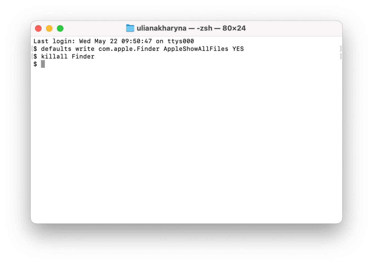 现在,这应该显示每个隐藏文件夹,包括 var。一旦您准备好再次隐藏它们,请转到终端并输入以下命令,并在每个命令后按 Return 键:defaults write com.apple.Finder AppleShowAllFiles NO进而killall Finder