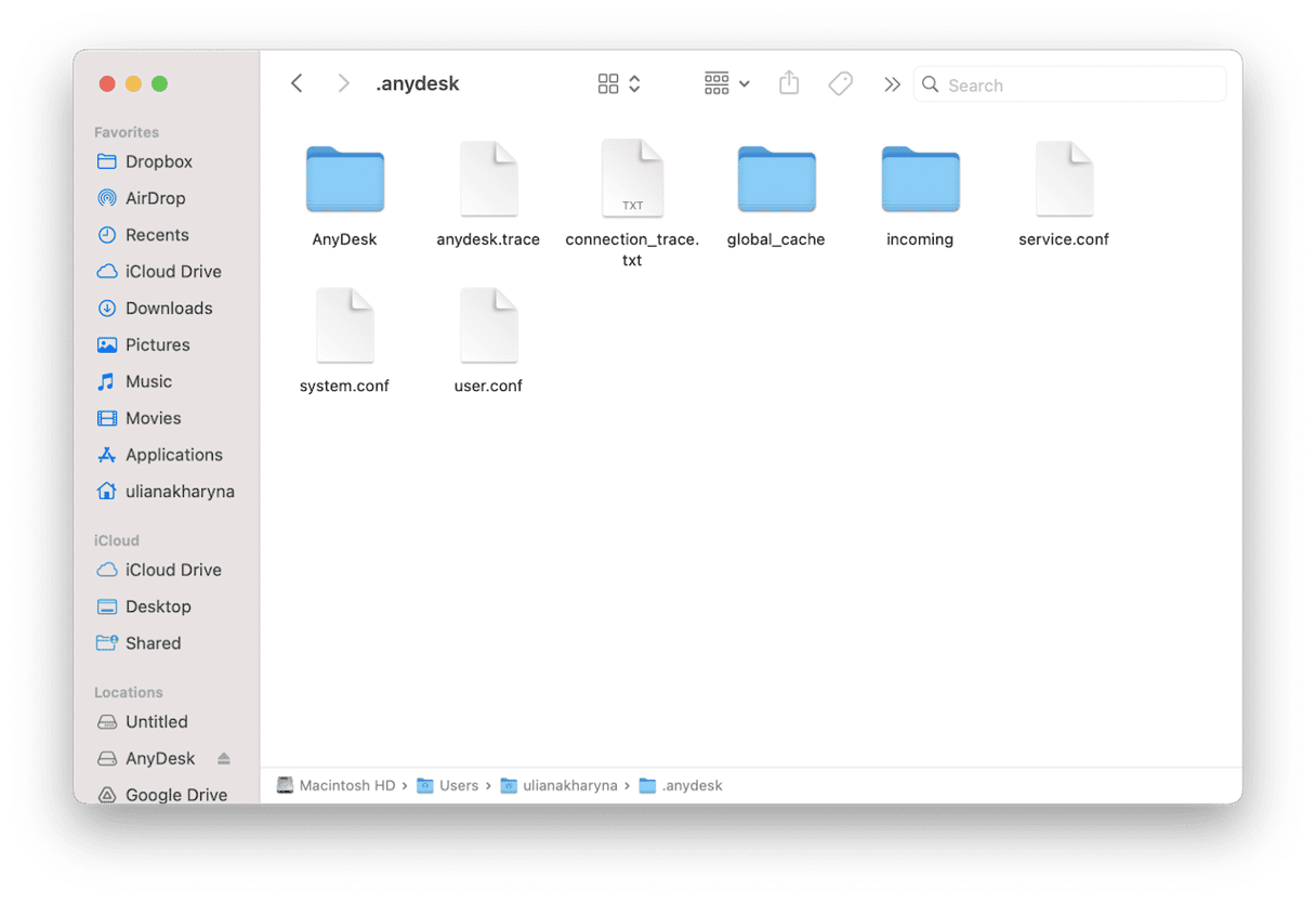 ~/.anydesk并按回车键。 - 将 .anydesk 和 .anydesk-ad_ 文件夹拖到废纸篓中。