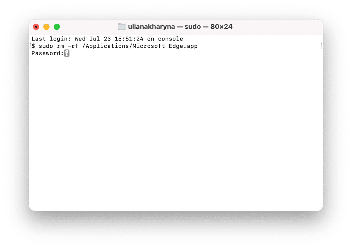 sudo rm -rf /Applications/Microsoft Edge.app - 输入您的密码,然后按回车键。