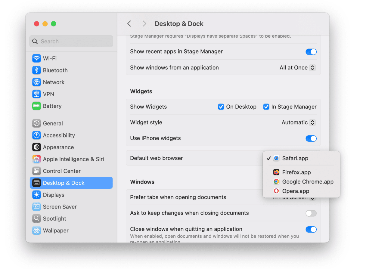 - 查找“默认 Web 浏览器”选项(它位于“小组件”部分的下方)