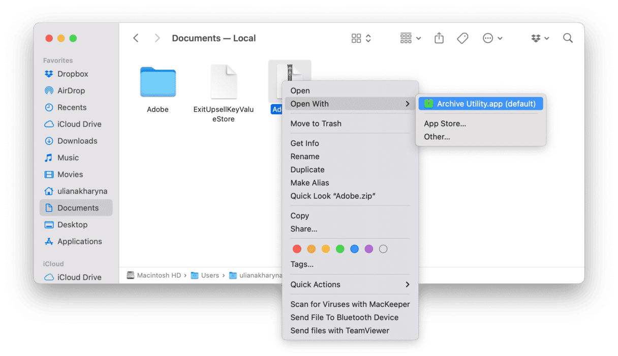 您还可以通过右键单击或按住 Control 键单击文件并选择“打开方式”来解压缩文件。如果 Archive Utility 是您安装的唯一解压缩实用程序,它将是唯一可用的选项。但是,如果您有 Better Zip 或 The Unarchiver 这样的工具,您将可以选择其中之一。