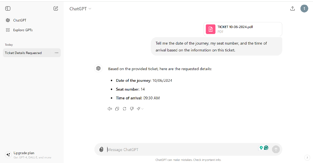 您还可以将多个 PDF 上传到 ChatGPT,并让聊天机器人对文件进行比较分析或浏览一份长期合同。聊天机器人完成这项任务的速度和准确性是惊人的。使用此功能的另一种实用方法是上传您的门票并要求机器人提取重要信息(例如您的座位号、旅程时间等)并以简单的方式呈现给您。