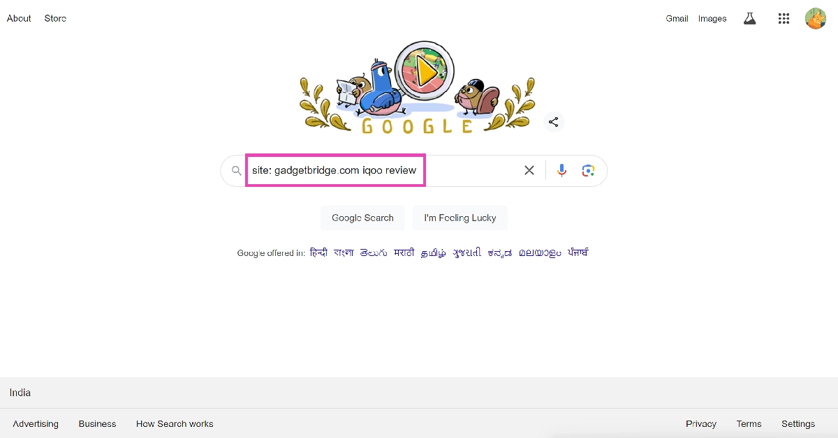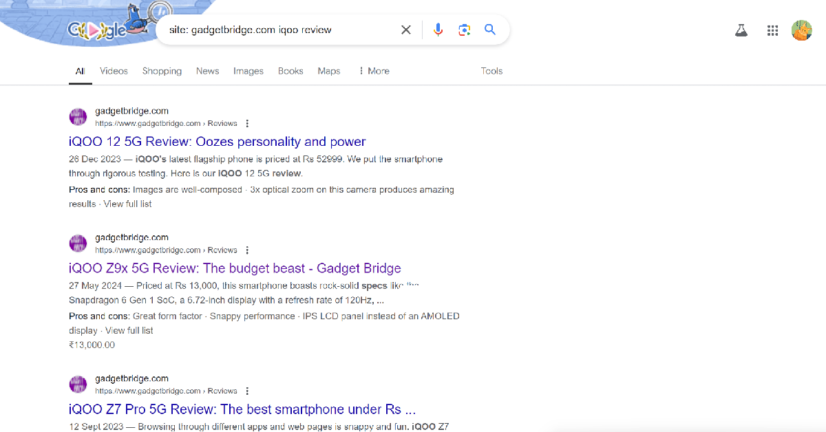 步骤2:输入您的搜索查询。例如,如果您正在寻找 iQOO 智能手机的评论,请输入网站:gadgetbridge.com iQOO 评测。