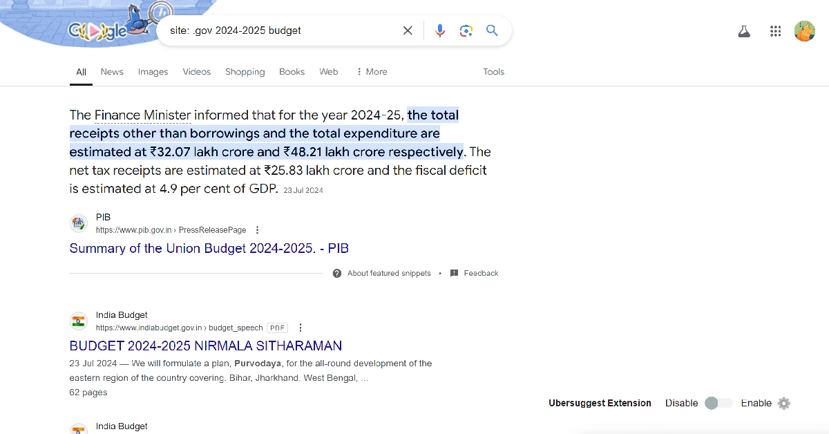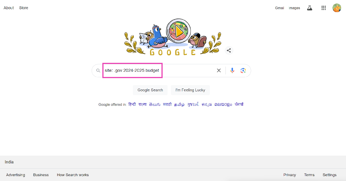 步骤2:输入您的搜索查询。例如:如果您正在查找与 2024-25 预算相关的详细信息,请输入网站:.gov 2024-25 年预算。