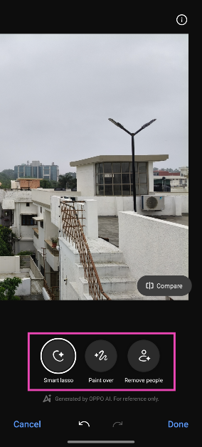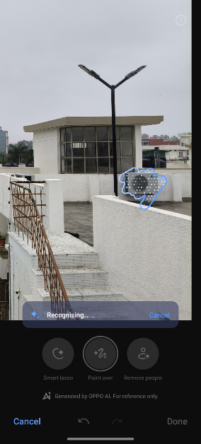 Oppo 的 AI 橡皮擦利用谷歌的 Gemini AI 进行编辑处理,识别并删除所选图像中不需要的图像。它的一组选择工具可以轻松标记和突出显示图片中不需要的对象。您可以选择圈出一个对象,也可以简单地用粗笔触覆盖它。然而,在 Oppo Reno 12 上使用 AI 橡皮擦时,我们发现它很难选择较小的对象。