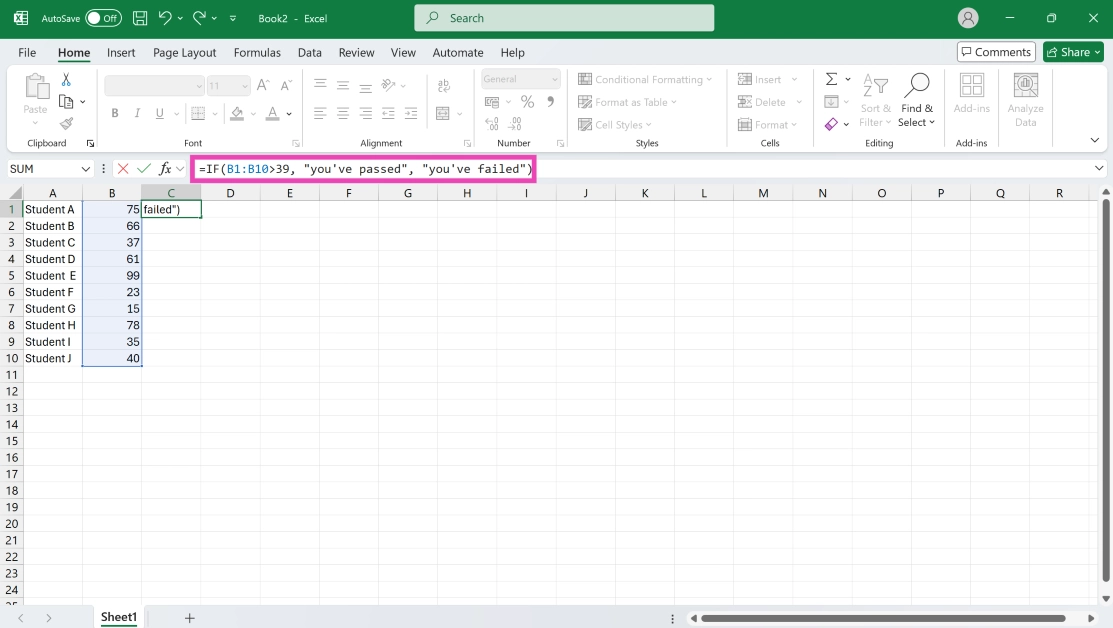 =IF(B1:B10>39, “您已通过测试”, “您未通过测试”)