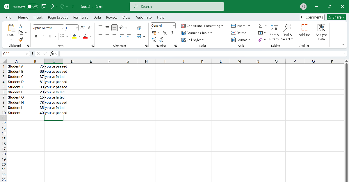 使用公式的主要目的是让它对大量数据进行计算工作。在微软Excel,您可以对整列使用 IF-THEN 函数。例如,您获得了每个学生在数学考试中的得分。您可以使用 IF-THEN 公式来确定学生是否通过了测试。方法如下。
