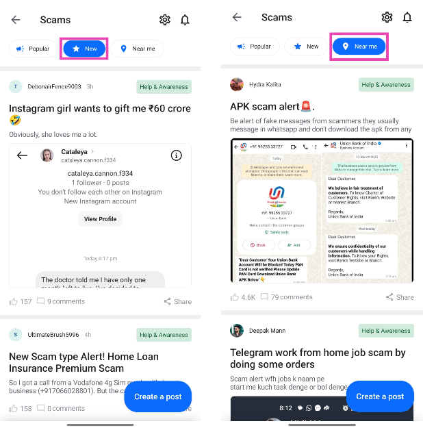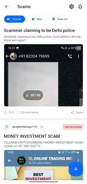 您可以按帖子的受欢迎程度、时间和地点来过滤帖子。要了解有关本地诈骗的更多信息,请尝试 Scamfeed 中的“我附近”过滤器。截至目前,Scamfeed 仅在印度可用。要在手机上使用此功能,请将 TrueCaller 应用程序更新到最新版本。 TrueCaller 将在未来几个月内在其他地区推出此功能。