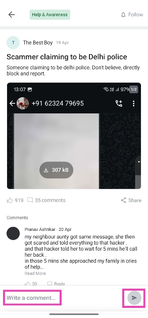 顾名思义,Scamfeed 是有关主题诈骗的帖子的滚动提要。用户可以创建帖子并向其中添加相关图像。帖子上线后,其他 TrueCaller 用户就可以点赞并发表回复。 Scamfeed 通过允许对其帖子进行连锁评论来促进讨论。