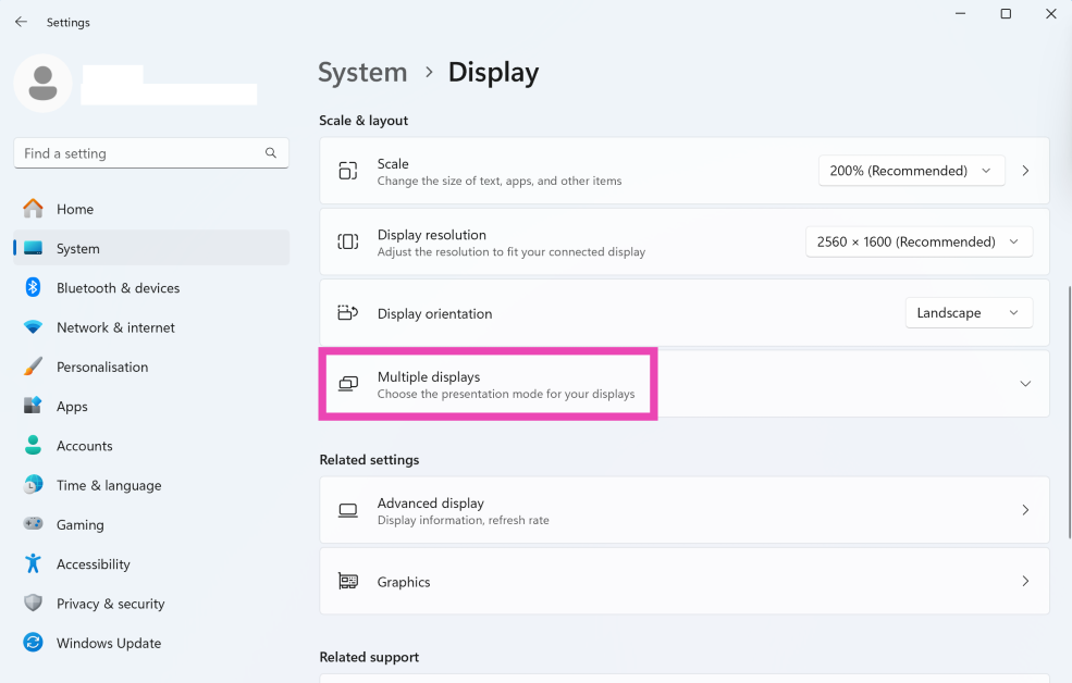 您可以使用 USB Type-C、HDMI 或显示线将笔记本电脑连接到外部显示器。完成后,转到设置>系统>显示>多显示器并选择是否要复制或扩展笔记本电脑的显示屏。