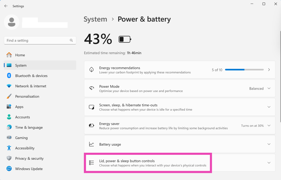 步骤3:展开盖子、电源和睡眠按钮控制类别。