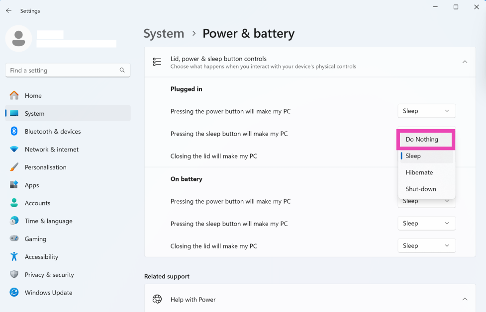 第4步:前往已插入和使用电池类别并展开旁边的下拉菜单合上盖子将使我的电脑。