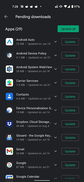 上述步骤讨论了为各个应用程序安装可用的应用程序更新,但您也可以选择列表顶部的“全部更新”按钮。这将安装您手机上安装的应用程序可用的每个更新。