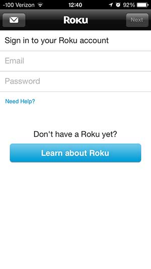 步骤 7:输入您的 Roku 帐户的电子邮件地址和密码,然后触摸下一个屏幕右上角的按钮。