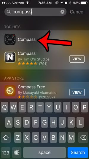 本文中的步骤是在运行 iOS 9 的 iPhone 5 上执行的。本文假设您当前在打开指南针应用程序时无法在屏幕底部看到纬度和经度。以下教程将向您展示如何为指南针启用定位服务,以便它能够利用设备上的 GPS 功能。
