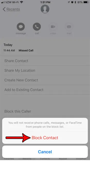 第 5 步:点击块接触按钮以确认您将阻止此号码通过电话、短信或 FaceTime 与您联系。