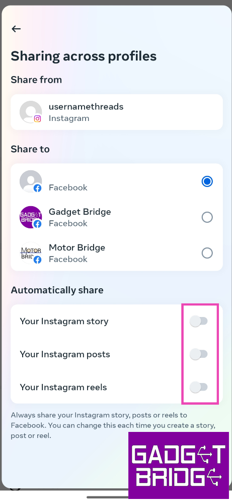要启用 Instagram 和 Facebook 之间的自动共享,请转至个人资料>菜单>设置和隐私>帐户中心>连接体验>跨个人资料共享。选择您的 Instagram 个人资料,然后打开故事、帖子和卷轴的切换开关。